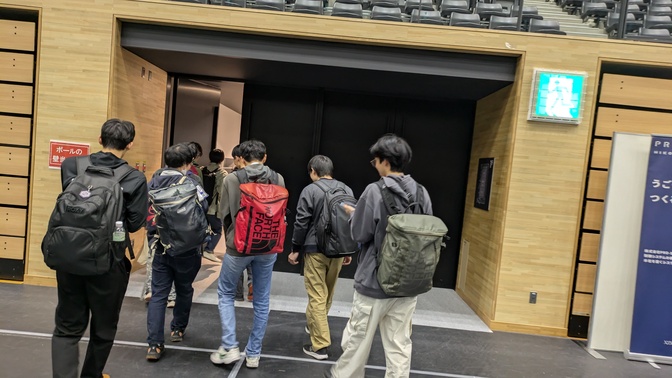 明日、4月25日から滋賀ダイハツアリーナで行われるRoboCup JapanOpen2026に向けて、現地に清水、田仲、鈴木、野々山、望月、西尾、岩月、小玉、藤井の学生9名と教員の伊藤がロボットのセットアップや調整を行いました!